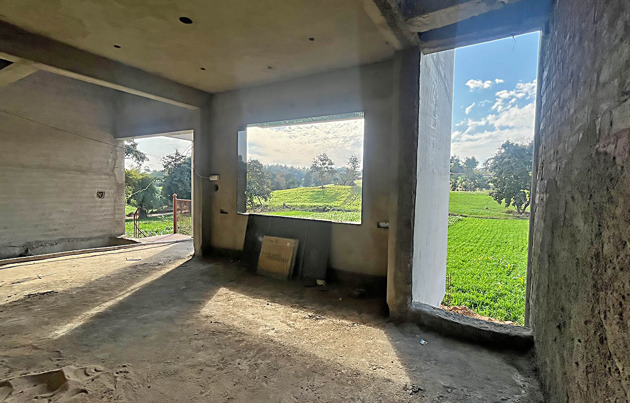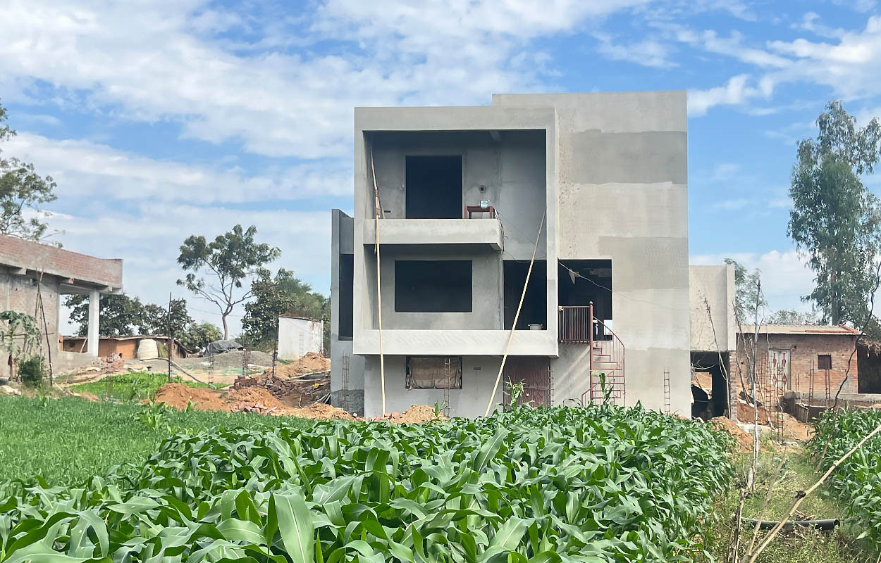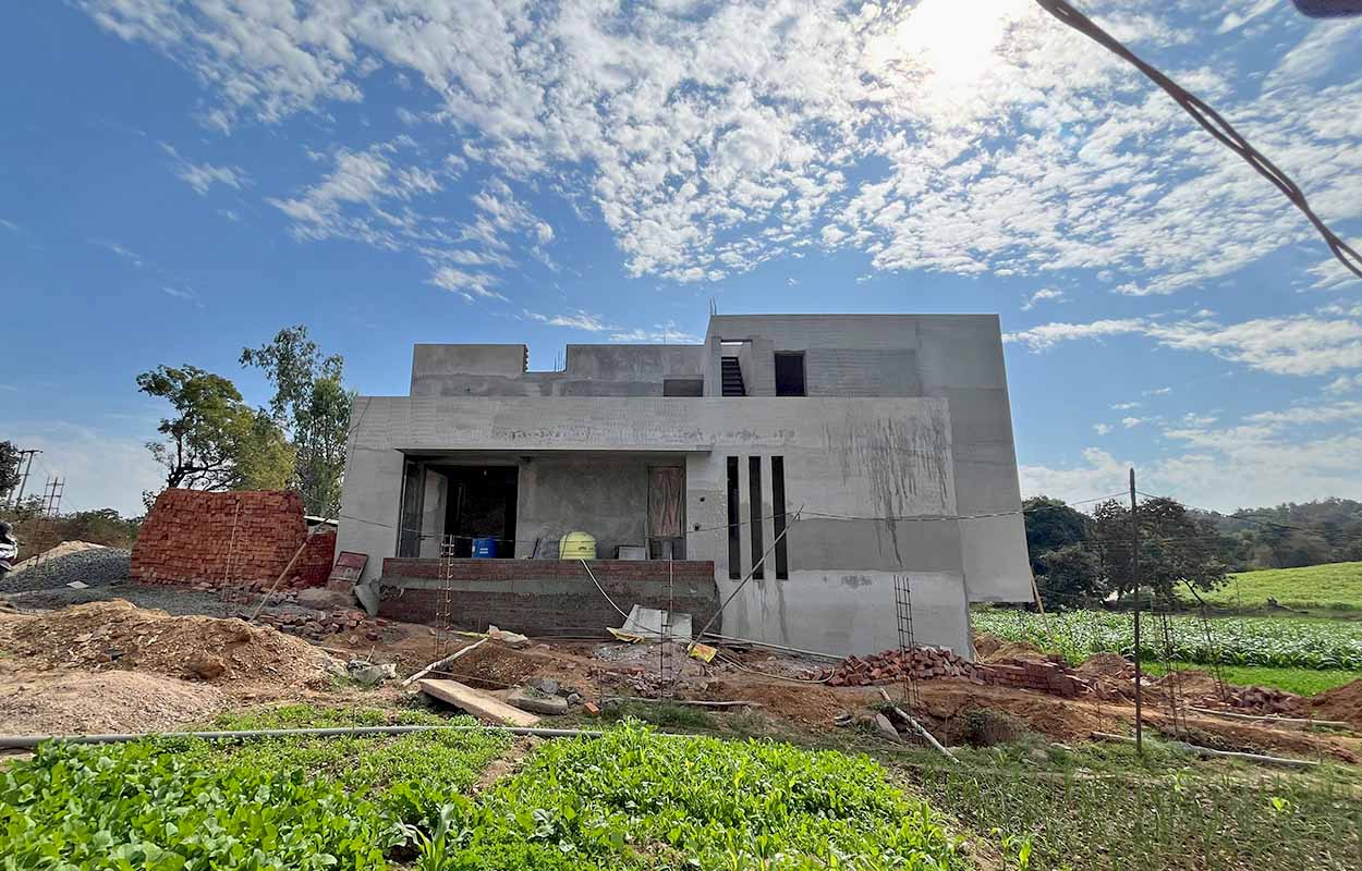 “Bhoomi,” meaning ‘earth’ in Sanskrit, is a farmhouse designed to reflect strength, honesty, and openness. With raw materials like exposed concrete and carefully carved voids, the space is a dialogue between solidity and light. The circular skylight invites the sky indoors, while the grounded textures and earthy palette pay homage to the land it stands on. This is a structure that grows from the earth and opens itself to the elements — a home in harmony with its rural setting.